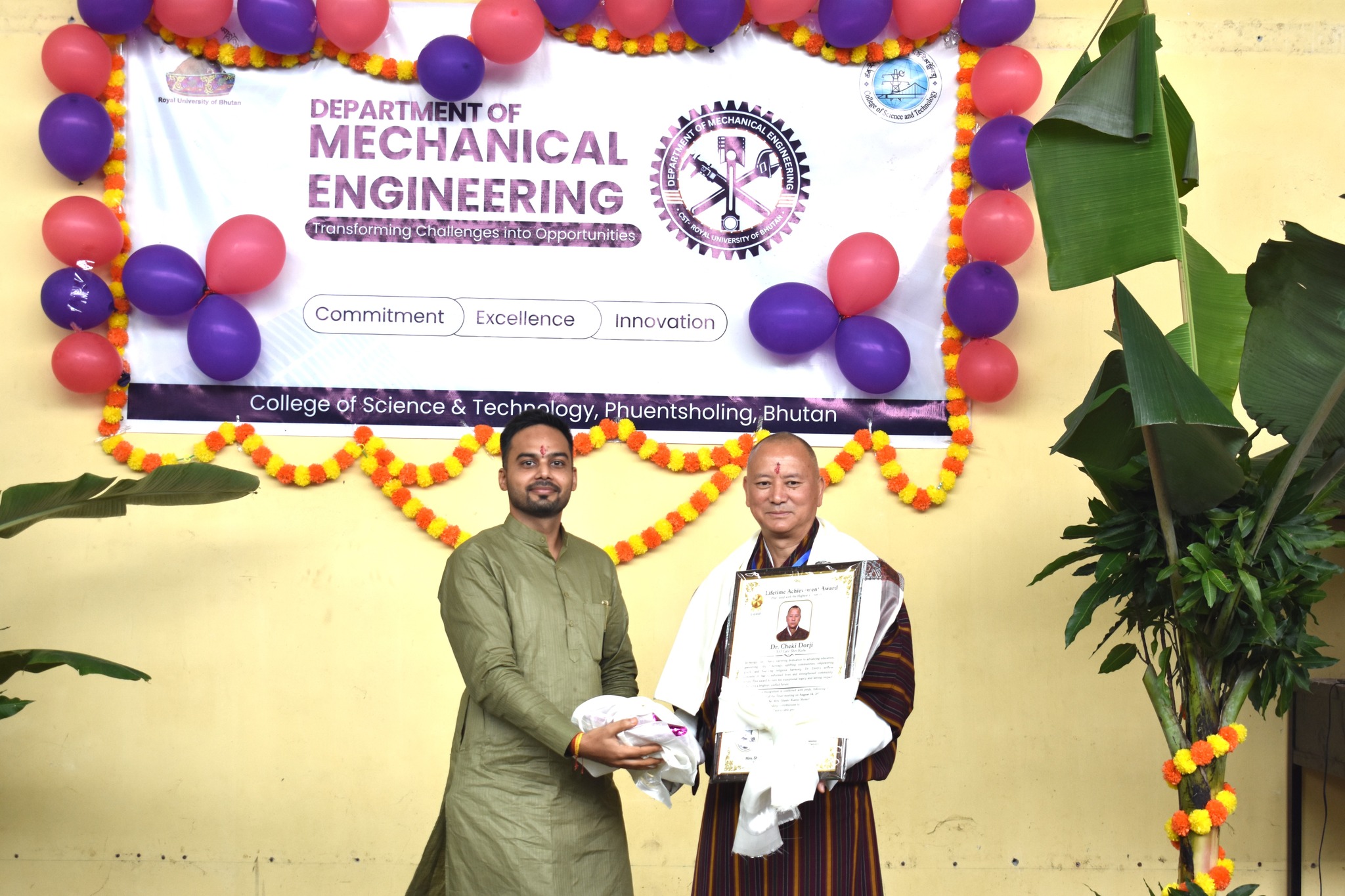On 17 September 2025, Dr. Cheki Dorji, President of the College of Science and Technology, was honoured with the ‘Lifetime Achievement Award’ by the Mrs. Shashikanta Memorial Foundation. The award was presented by Prof. Agarwal on behalf of the foundation, recognizing Dr. Dorji’s decades of exemplary service in education, research, community development, and youth empowerment.